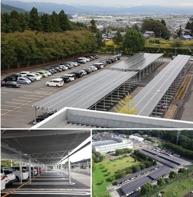 最近,村田事務(wù)所的子公司Kanazu Murata Manufacturing(福井縣蘆原市)安裝了車(chē)棚式太陽(yáng)能發(fā)電系統(tǒng) [ 組件數(shù)量:1,257(型號(hào)名稱(chēng):DM305-M156-60),總輸出功率:383kW,數(shù)量停車(chē)位:167],我們通過(guò)Yuasa Trading Co.,Ltd.交付了我們公司TMM Japan的車(chē)棚。